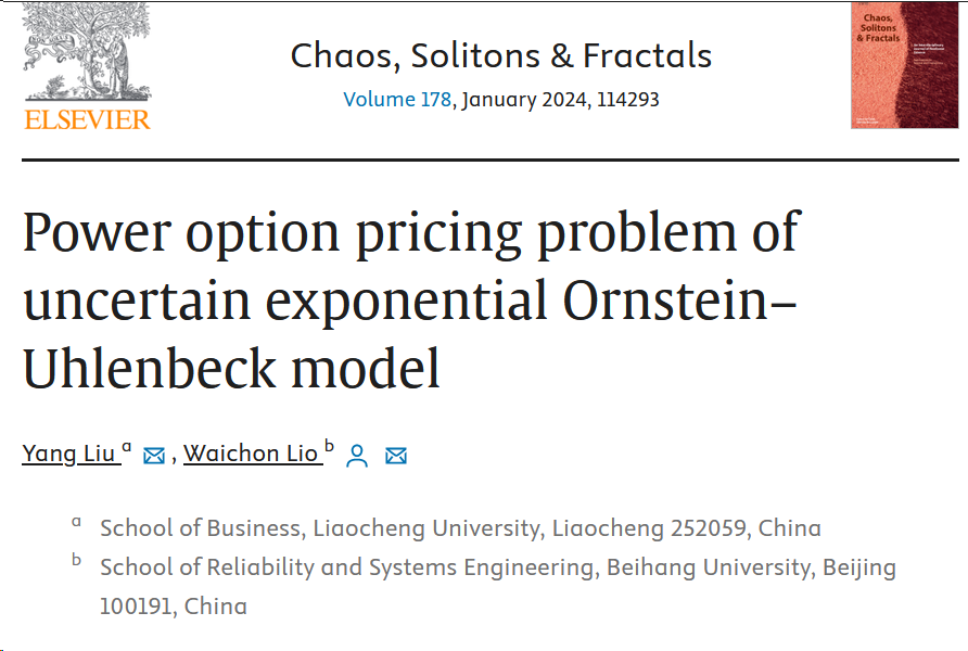 在最新的金融研究中,我院教师刘洋博士在期权定价领域取得了重大突破,相关研究成果“Power option pricing problem of uncertain exponential Ornstein–Uhlenbeck model”已在国际顶级期刊《Chaos, Solitions & Fractals》(混沌、孤立子与分形)发表。这项研究不仅深化了对幂期权的理解,同时拓展了金融衍生品定价的理论框架,为投资者提供了更为准确和可靠的定价模型。