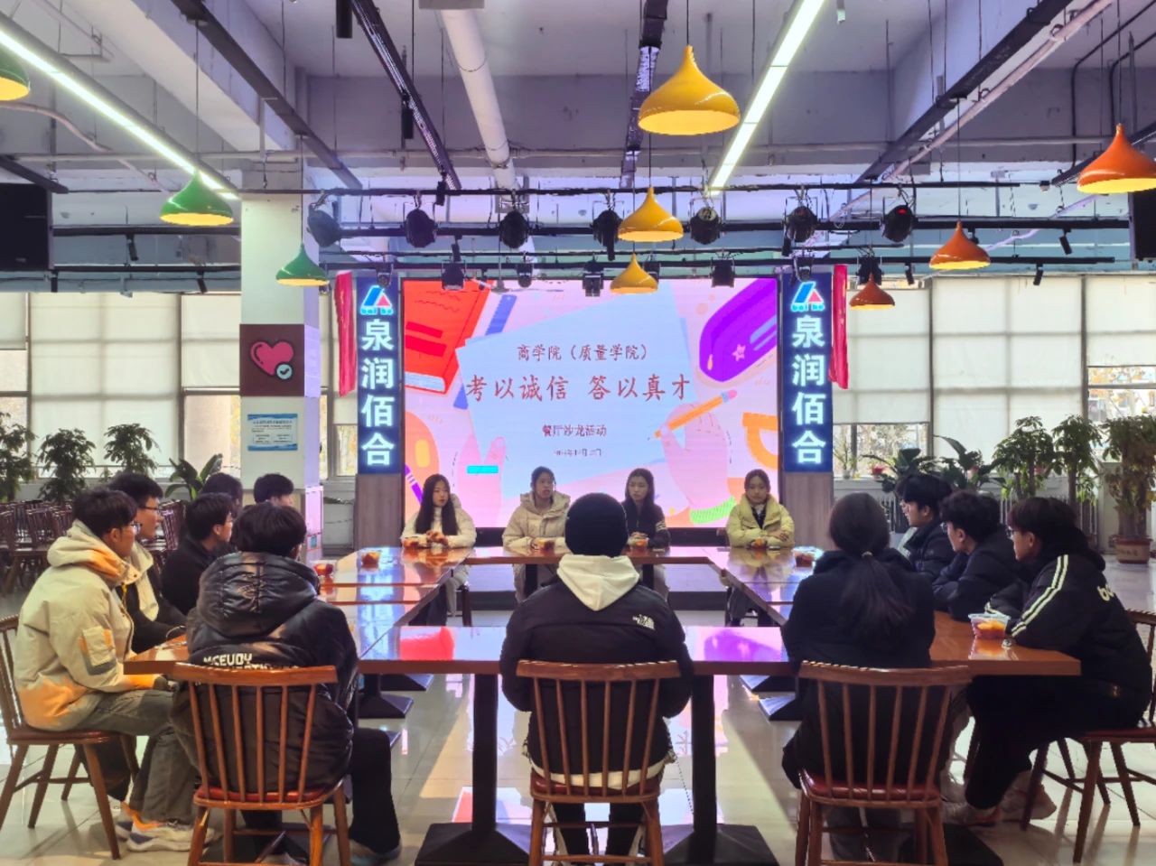为严肃考风考纪,规范考试秩序,引导学生筑牢诚信根基,切实加强优良考风学风建设,维护教育考试的公平公正,12月12日,威斯尼斯人8188cc官网(质量学院)于东校区翰苑餐厅二楼开展了“考以诚信、答以真才”主题餐厅沙龙活动,学院辅导员施安琪老师和刘聪睿老师结合各类全国性考试以及体育测试中的作弊替考行为,对同学们在考试中出现违纪心理进行分析,让学生从思想上高度重视考纪的严重性。