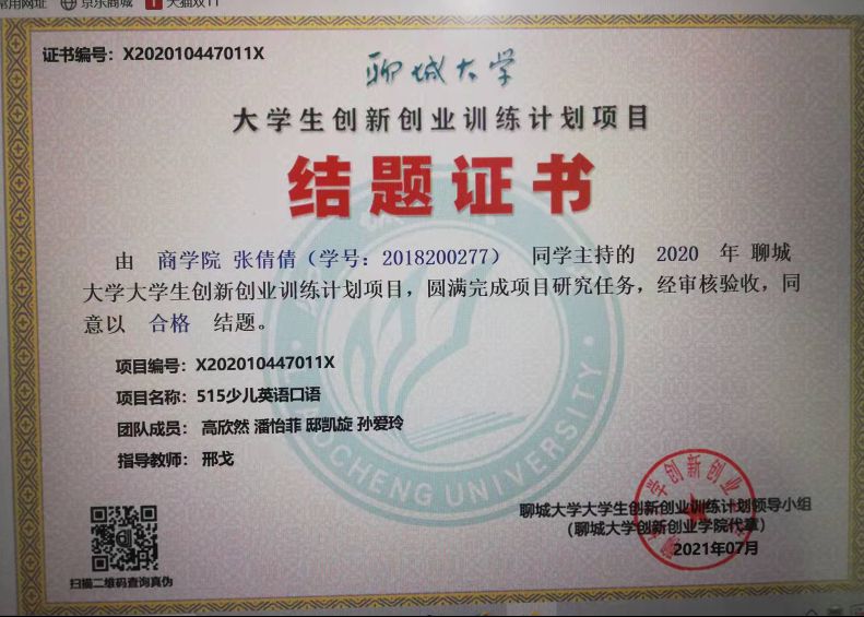 2021年7月,高欣然在2020年聊城大学大学生创新创业训练计划项目以合格结题,特此,对以上获奖同学予以祝贺表彰。