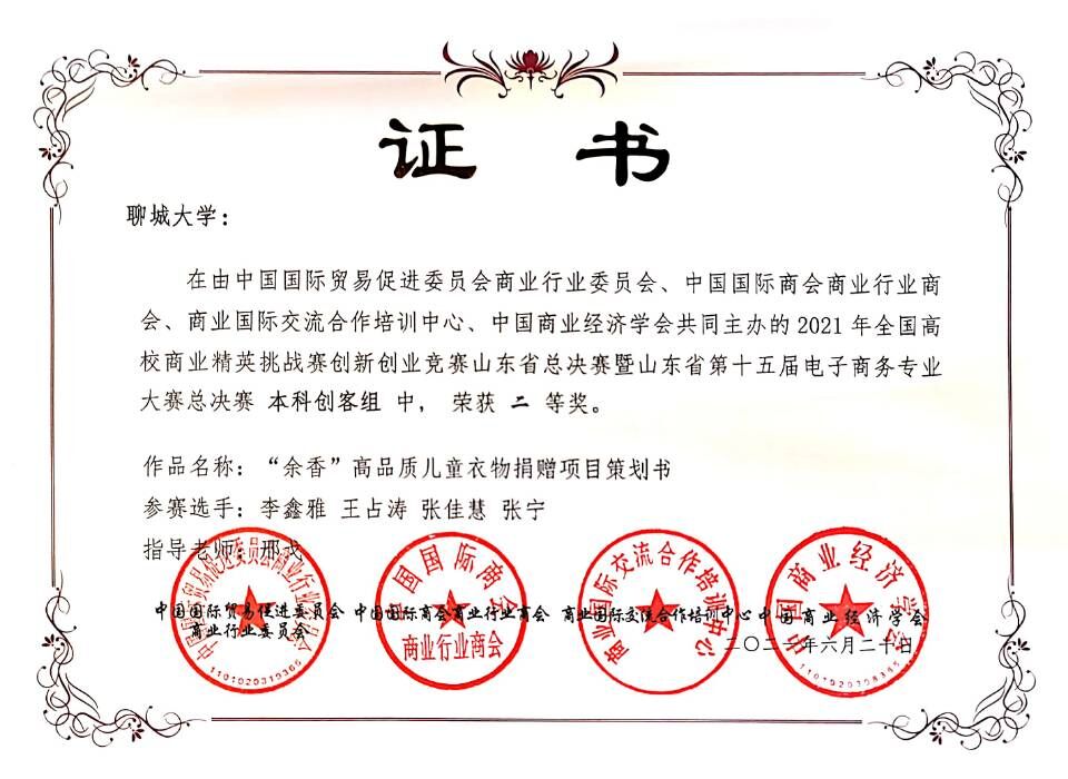 张佳慧于2021年6月20日荣获2021年全国高校商业精英挑战赛创新创业竞赛山东省总决赛暨山东省第十五届电子商务专业大赛总决赛本科创客组二等奖