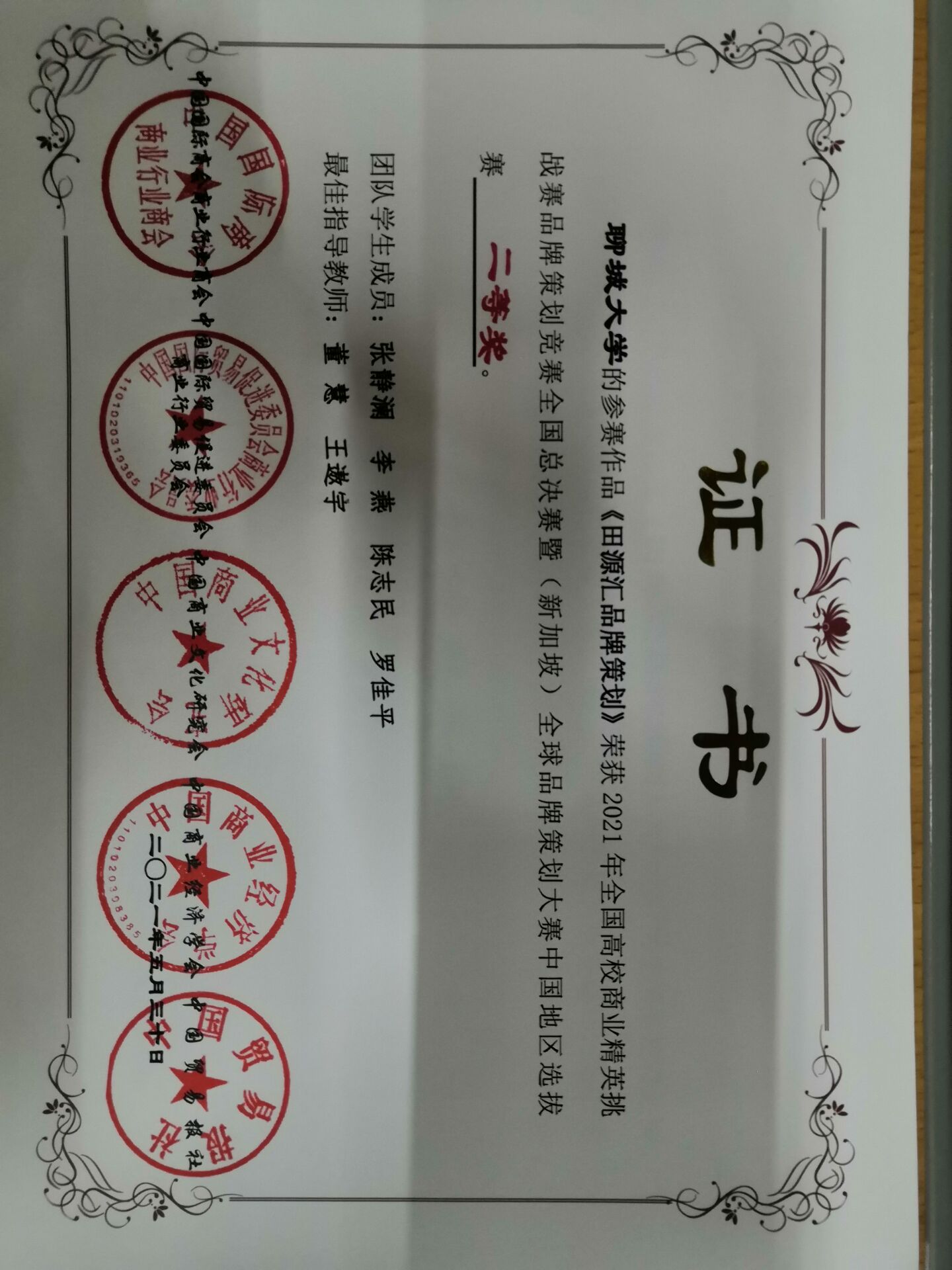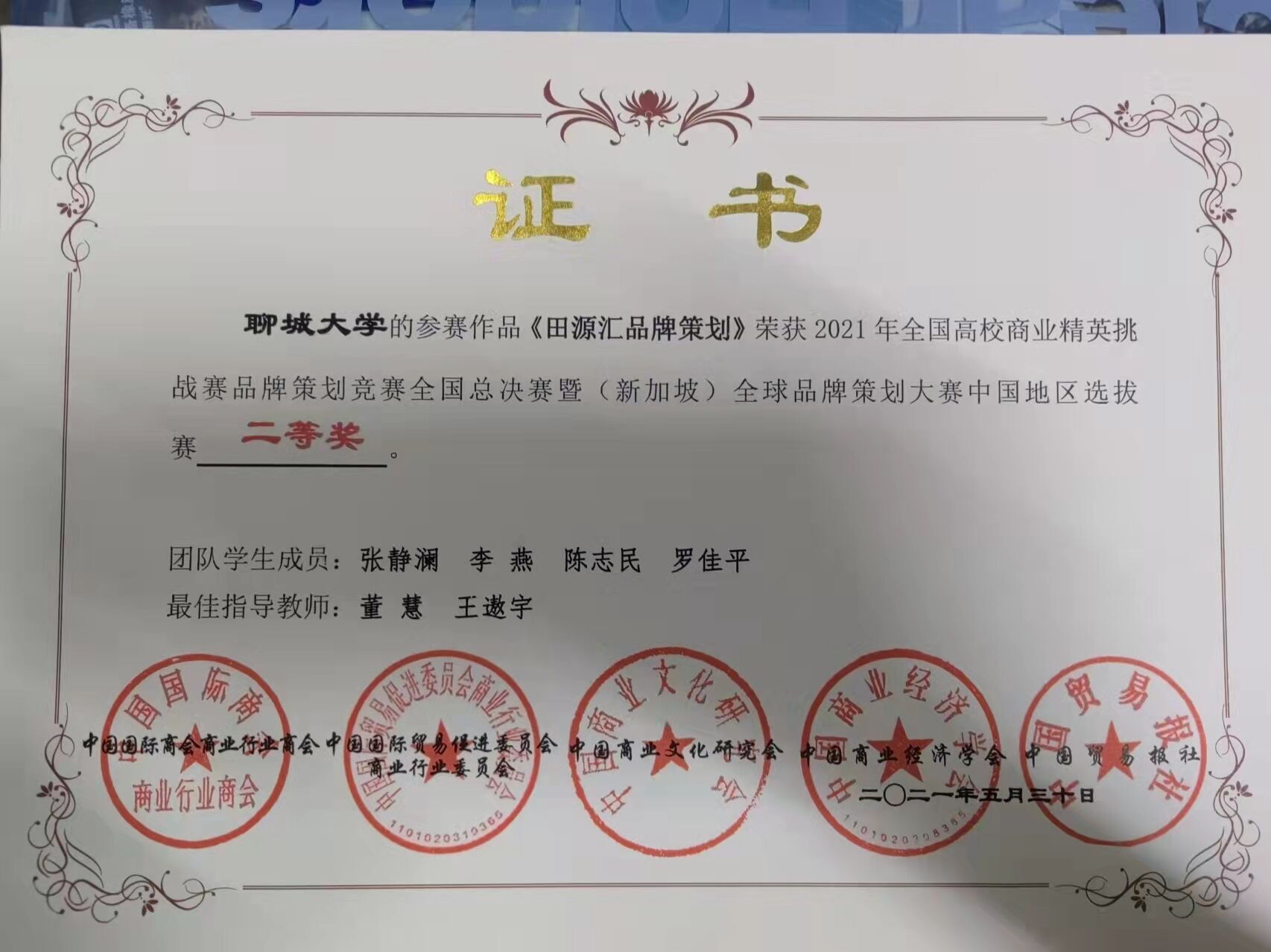 张玉霞于2021年5月30日荣获2021年全国高校商业精英挑战赛品牌策划竞赛全国总决赛暨(新加坡)全球品牌策划大赛中国地区选拔赛二等奖