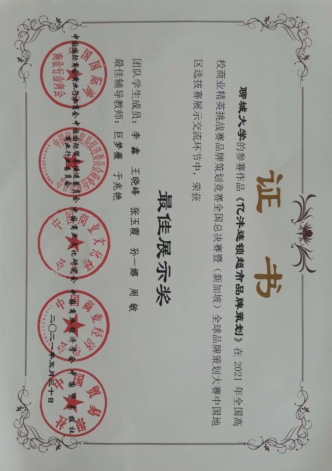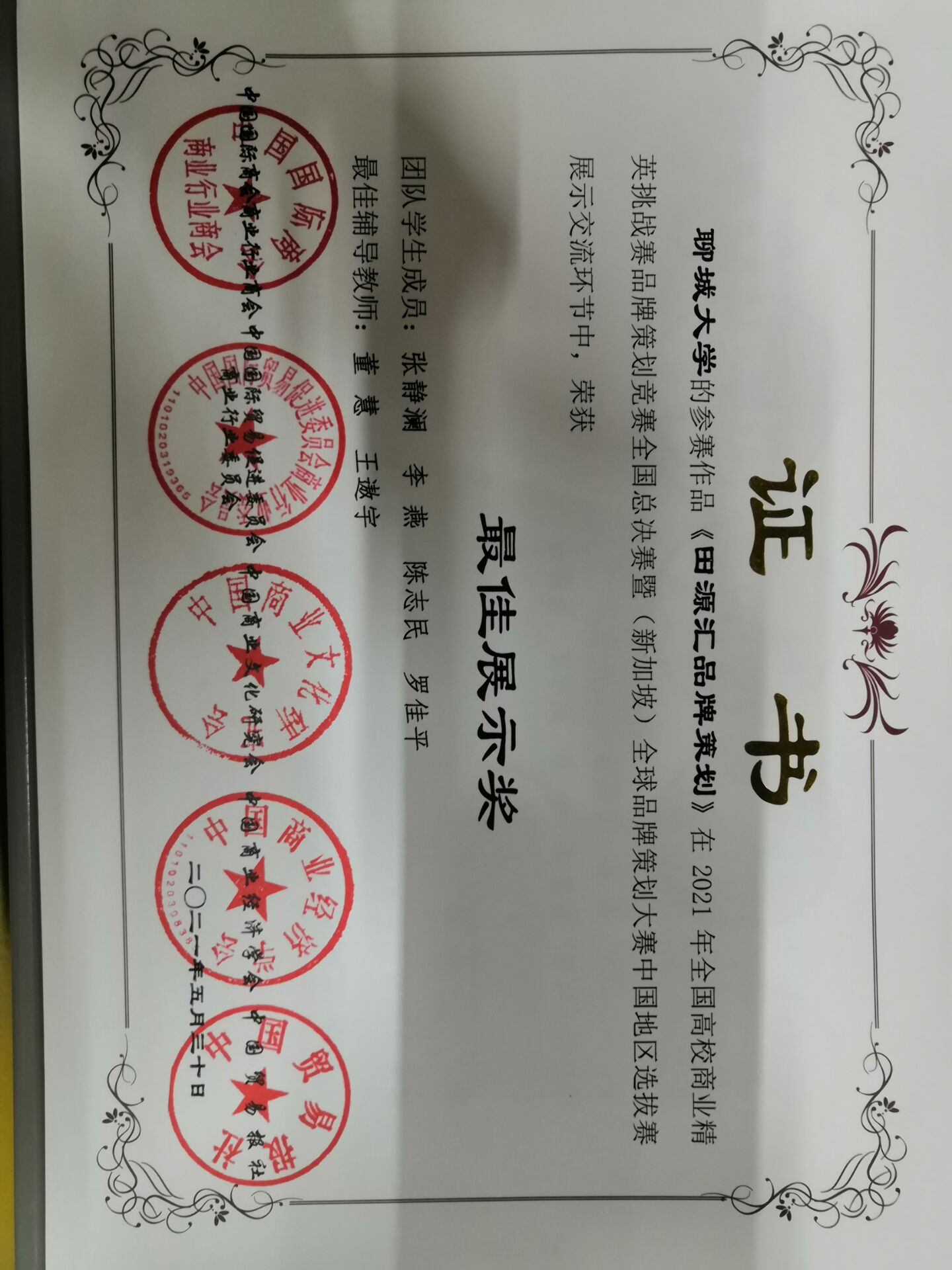 李燕于2021年5月30日荣获2021年全国高校商业精英挑战赛品牌策划竞赛全国总决赛暨(新加坡)全球品牌策划大赛中国地区选拔赛展示交流环节中最佳展示奖