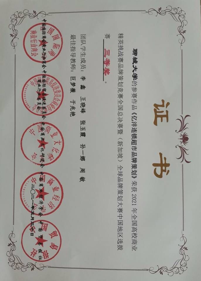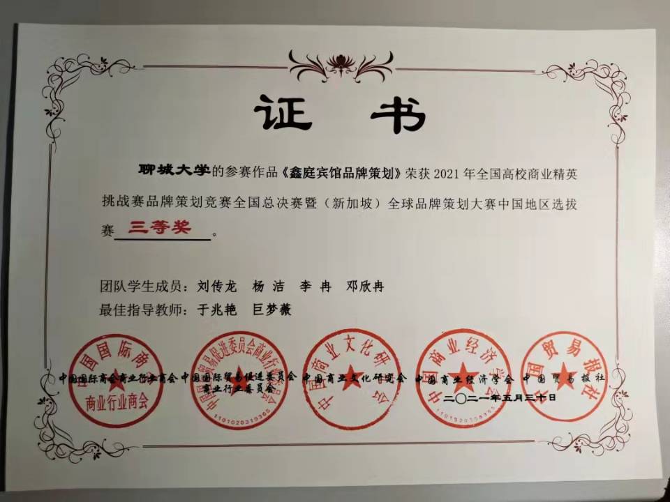 张玉霞于2021年5月30日荣获2021年全国高校商业精英挑战赛品牌策划竞赛全国总决赛暨(新加坡)全球品牌策划大赛中国地区选拔赛三等奖