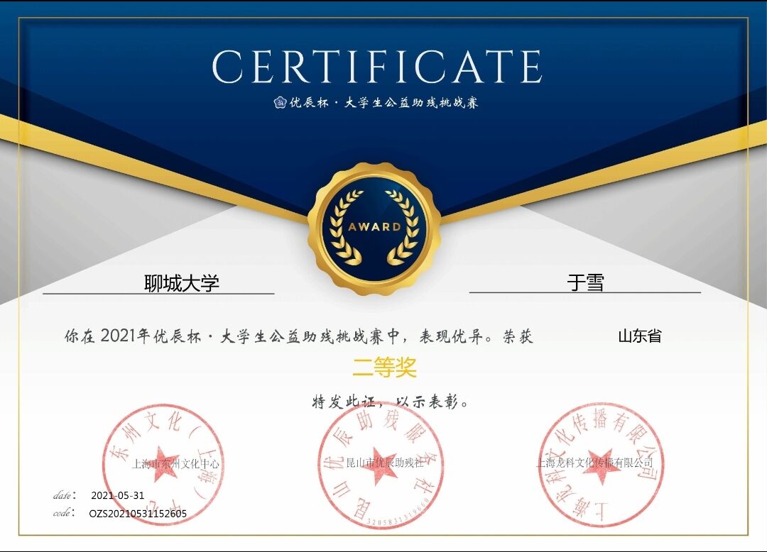 于雪于2021年5月31日荣获2021年优辰杯大学生公益助残挑战赛二等奖