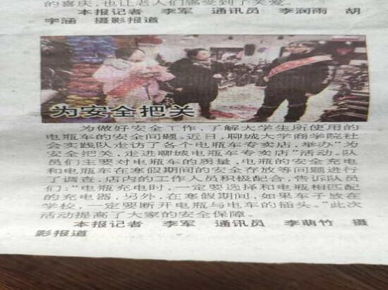 为做好安全工作,了解大学生所使用的电瓶车的安全问题。近日,威斯尼斯人8188cc官网社会实践队走访了各个电瓶车专卖店,举办“为安全把关,走进聊城电瓶车专卖店”活动。 队员们主要对电瓶车的质量、电瓶的安全充电和电瓶车在寒假期间的安全存放等问题做出了调查,店内的工作人员告诉队员们:“牌子出名的车子一般质量都比较好,电瓶充电时,一定要选择和电瓶相匹配的充电器,另外,在寒假期间,如果车子放在学校,一定要断开电瓶与车子的插头。”队员们希望通过此次活动,提高大家的安全保障。