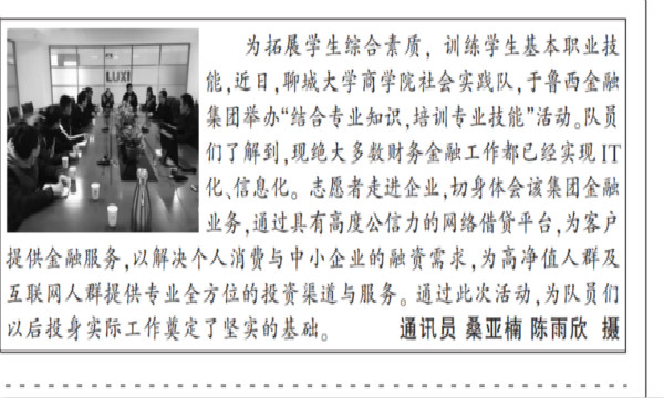 为拓展学生综合素质,训练学生基本职业技能,近日,威斯尼斯人8188cc官网社会实践队,于鲁西金融集团举办“结合专业知识,培训专业技能”活动。志愿者了解到,现绝大多数财务金融工作都已经IT化、信息化。志愿者走进企业,切身体会该集团金融业务,通过具有高度公信力的网络借贷平台,为客户提供金融服务,以解决个人消费与中小企业的融资需求,为高净值人群及互联网人群提供专业全方位的投资渠道与服务。通过此次活动,为队员们以后投身实际工作奠定了坚实的基础。