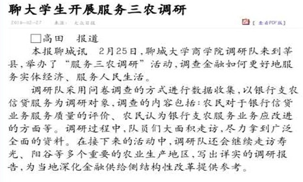 调研队采用问卷调查的方式进行数据收集,以银行支农信贷服务为调研对象,调查的内容包括:农民选择申请的银行对于农民信贷业务的服务质量的评价、农民认为银行支农服务业务应改进的方面等部分。调研过程中,队员们大面积走访,尽力拿到更广泛全面的资料。在接下来的活动中,调研队还会继续走访寿光、阳谷等多个重要的农业生产地区,写出详实的调研报告,为当地深化金融供给侧结构性改革提供参考。(通讯员李炜昊刘泽华)