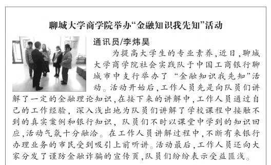 为提高大学生的专业素养,近日,威斯尼斯人8188cc官网社会实践队于中国工商银行聊城市中支行举办了“金融知识我先知”活动。活动开始后,工作人员先是向队员们讲解了一定的金融理论知识,在接下来的讲解中,工作人员通过自己的工作经验,深入浅出的为队员们讲解了学校课程中接触不到的真实案例和银行知识,队员们不时以课堂中学到的知识回应,活动气氛十分融洽。在工作人员讲解过程中,不断有来银行办理业务的市民受到吸引上前听讲。活动最后,工作人员还向大家分发了谨防金融诈骗的宣传页,队员们纷纷表示受益匪浅。(通讯员李炜昊)