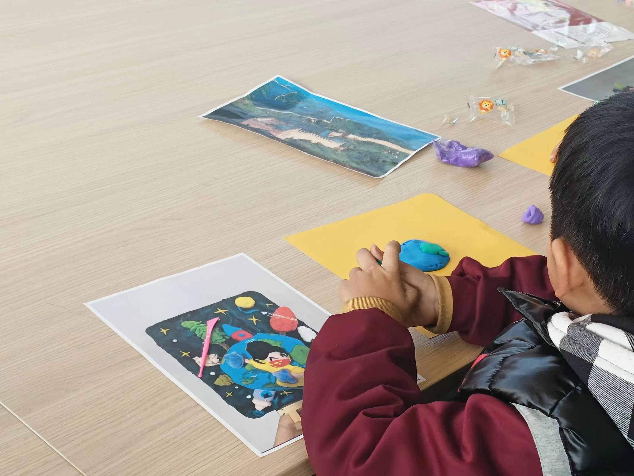 志愿者走进高新区官庄村,与小朋友们对接学习任务,帮助他们解决学习方面的难题,提高完成作业的效率与学习自觉性。在完成学习任务后,志愿者们为小朋友们准备了一场别开生面的天文课堂-地球篇。课堂上,志愿者们向小朋友们分发地球的彩色图片与地球知识的相关学习资料,并以生动形象、浅显易懂的语言对地球进行介绍,例如世界七大洋,中国长城,巴黎埃菲尔铁塔,东非大裂谷,埃及金字塔等,带领他们更好地认识地球总体构造以及著名的地标等。在完成简单的地理知识科普后,志愿者们带领小朋友们开展了一场有趣的黏土手工制作活动。孩子们在志愿者们的指导下,用黏土制作出世界七大洋、六大板块、长城、金字塔等模型。让他们在动手制作的过程中,加深对地球构造和地表标志的理解,锻炼了他们的动手能力和创造力。