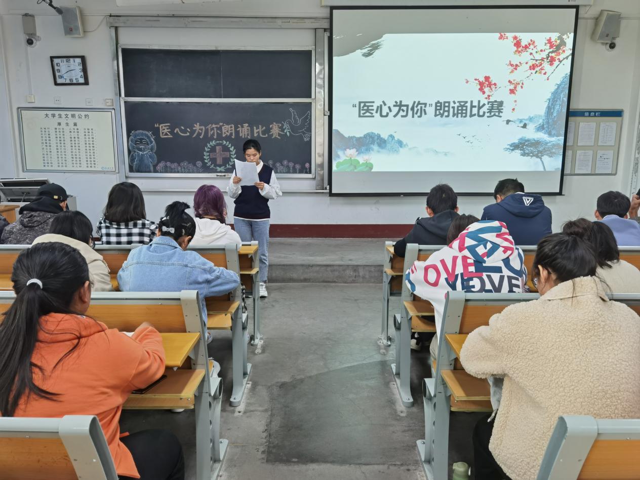 为了表达疫情期间大家对不畏生死,为国请命的医护人员的敬仰与崇敬,进一步向医护人员学习英雄精神,威斯尼斯人8188cc官网于11月7号在东校区1#405举办了“医心为你”朗诵比赛。 活动开始前,参赛者们认真研读朗读稿,探究朗读稿背后的感人故事,以此来激发内心深厚的情感,从而通过文字释放出来。活动在主持人精彩的致辞后开始,参赛者个个精神饱满,满怀激情地上台朗诵,用自己铿锵有力的语调释放情感,用抑扬顿挫的声调讴歌医护人员,用优美流畅的语言赞美他们的“南丁格尔”精神。他们声情并茂,通过飞扬的神采来反映朗诵的内涵,通过得体大方的姿势来表达激烈的情感,他们用朗诵和台下观众与评委互动,用声音产生情感的共鸣,全场气氛高涨,反应热烈。活动主要采取计分制,由评委打分按分数高低排名,感情真挚者为优。最后,伴随着优美的朗诵声,活动顺利结束。
