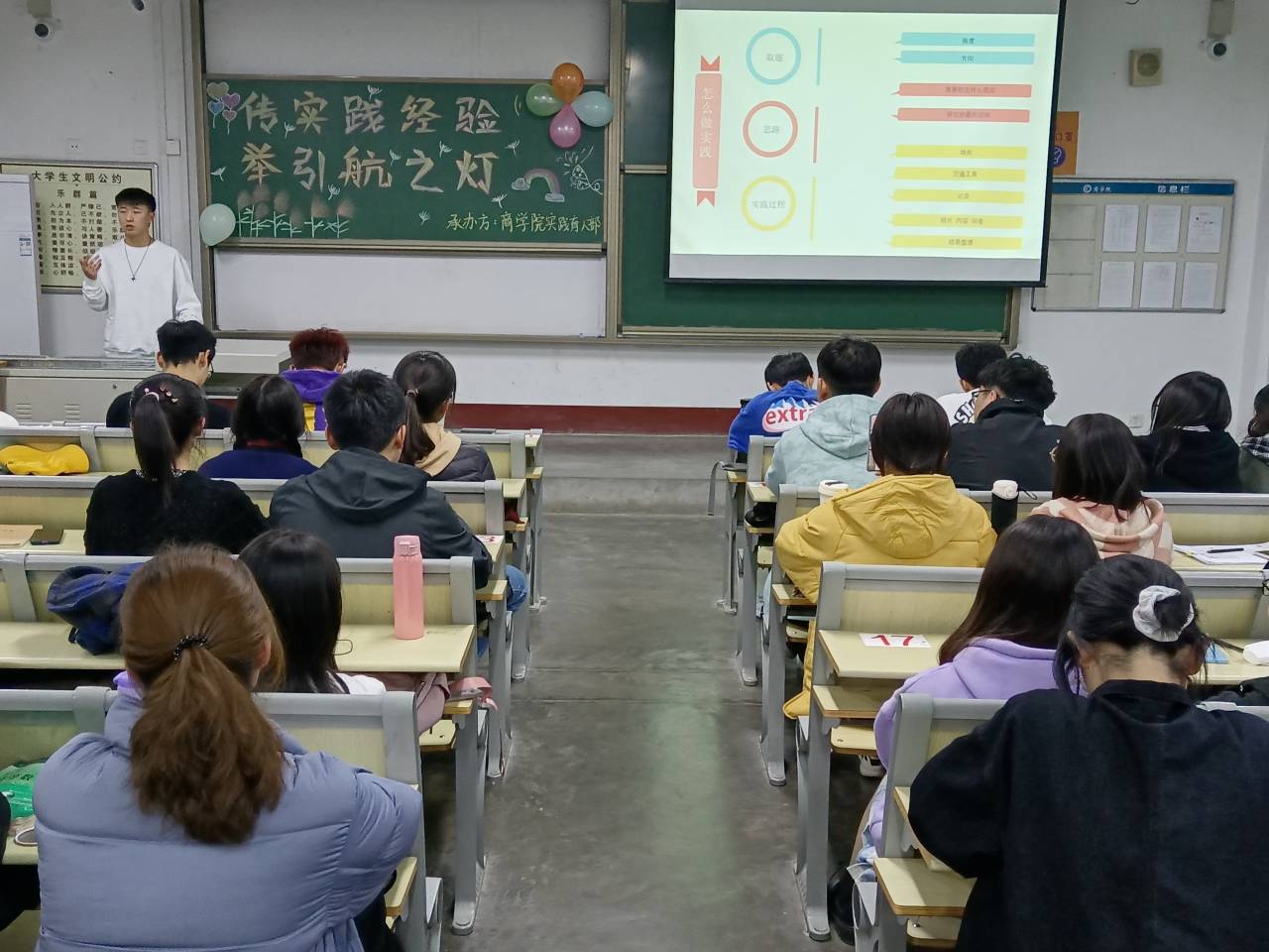 本次活动采用经验交流分享会的形式,邀请经验丰富的社会实践优秀学生代表向20级新生分享自己在社会实践方面的经验和心得体会。活动伊始,由主持人致辞,介绍六位优秀的社会实践代表。紧接着,六位学生代表依次上台分享自己的实践经验,分别通过精美的PPT和有趣的小视频,向大家介绍了如何撰写策划案、活动总结以及答辩技巧等。同学们认真倾听,仔细做好笔记,以便在社会实践中将经验转化为实践。在仔细的倾听过后,同学们积极提问,学生代表们也耐心解答。最后,由李柯新上台发表讲话,主要阐述了自己对社会实践的看法,她希望同学们积极走出校门,开展社会实践,增强责任感使命感,提高自身素质。