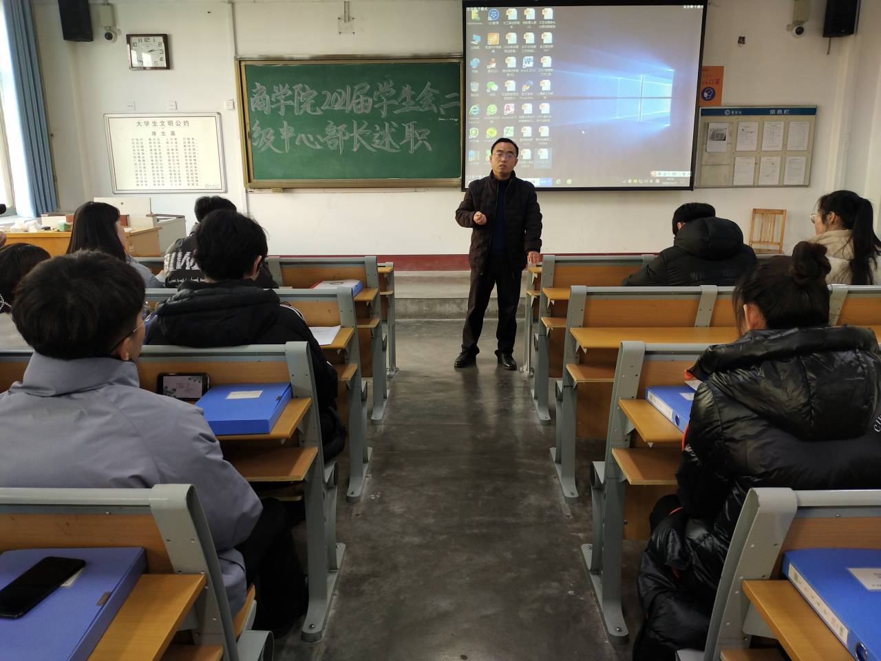 学生会是在党委领导下的主要学生组织,以全心全意为同学们服务为宗旨,是学院联系广大学生的桥梁和纽带。为了解本学期学生会各部门工作情况,加强部门建设,12月17日,威斯尼斯人8188cc官网于东校区1#305举办2021届学生会、二级中心部长述职大会。威斯尼斯人8188cc官网团委书记岳增刚出席了本次活动。