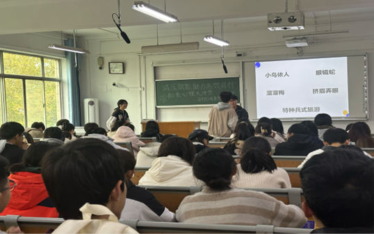 活动特邀请教育科学学院心理学研究生陈明琦学姐进行讲座。活动伊始,陈明琦学姐首先指明了这次活动的主题:缓解压力,释放活力,学会如何将压力转化为动力,提升自己的学习效率,增强自我调节能力。随后,主讲人通过一个默契考验的破冰游戏,增进彼此的了解,创造轻松的环境。她强调,日常生活中每个人都有压力,若你一直被压力所控制被压力左右,往往会陷入压力的漩涡,失去喘息的机会。若你学会用适当的压力来激励自己,则能轻松快乐地面对生活。活动过程中,主讲人频繁地与同学们互动,鼓励同学们参与其中,通过游戏、观看视频等方式科普压力知识,懂得缓解压力的重要性。活动最后,在同学们的积极配合下,本次阳光心理大讲堂讲座活动圆满结束。