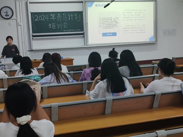 主讲人先从青鸟计划的背景出发,围绕青鸟计划是什么、做什么、怎么做展开讲解,让同学们对青鸟计划有了初步地了解。随后,主讲人系统性地讲述了青鸟计划的全流程,主要包括报名、培训、实践和总结四个环节,着重强调了报名的注意事项,并进行现场指导,帮助同学们顺利完成报名工作。同时,主讲人希望大家认真投入,把此次机会作为走出校门、了解社会的第一站;希望大家勤于思考,把握此次学习本领、增长才干的机会;希望大家求实上进,将此次机会作为参与家乡建设的新起点。最后,主讲人通过向学子们展示近年来青鸟计划的优秀成果,让同学们对青鸟计划有了更加深刻地认识,激发了同学们的参与热情。