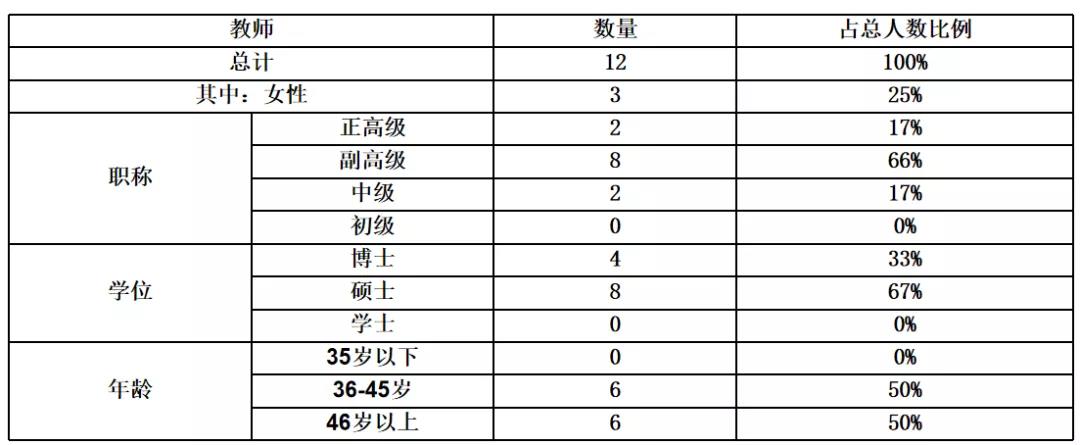 本专业拥有专兼职教师20人,专职教师12人,其中教授、副教授10人,具有博士学位的4人。外聘学术型专家2人,实践型专家4人。