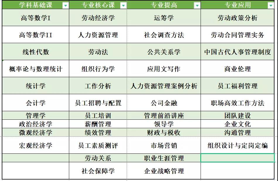 围绕人力资源专业八大模块设置了人力资源规划、人员招聘与配置、培训开发与实施、绩效考核与实施、薪酬福利、员工关系管理、职业生涯管理和人事管理核心课程,并开设相应基础课程和提高方向课程。