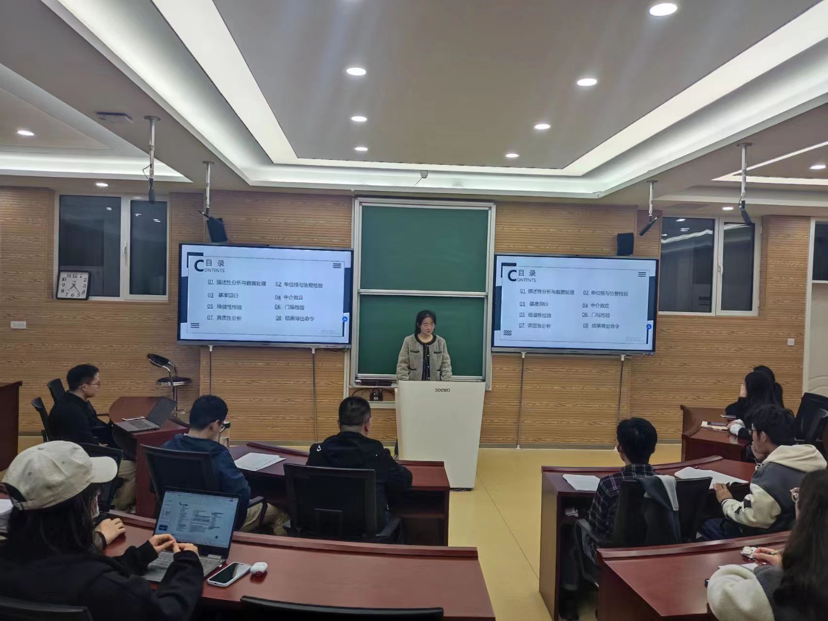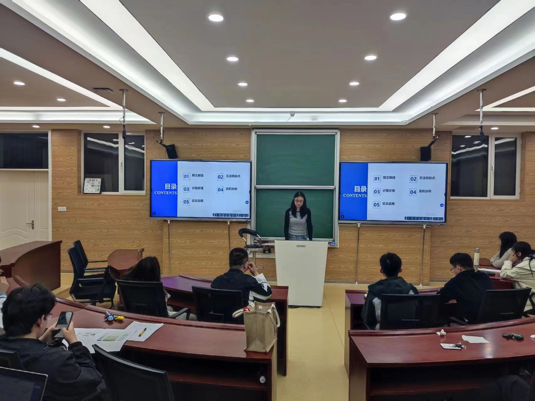 在交流会下半场,精彩“研”续。主讲人宋欣欣对“中介效应检验程序及其应用”展开汇报,就中介变量定义、中介效应分析和中介效应分析案例向大家做出讲解。紧接着,主讲人王晨曦介绍了“综合评价模型—灰色关联分析”,详细地展示了“灰色关联分析”的概念、方法优缺点、计算步骤、实例分析和论文应用五个方面。主讲人王凡对“动态面板模型及其Stata运用”展开汇报,就动态面板模型简介、动态面板模型的实证步骤与动态面板模型的Stata运用向大家做出讲解。主讲人李绍平的汇报主题是“效率测度方法及其应用”,针对效率的定义与效率的测度方法展开分享。最后,主讲人焦健带来了“熵值法的Stata操作应用”,结合截面和面板数据进行案例分析,并对熵权TOPSIS与熵值法加以区分。