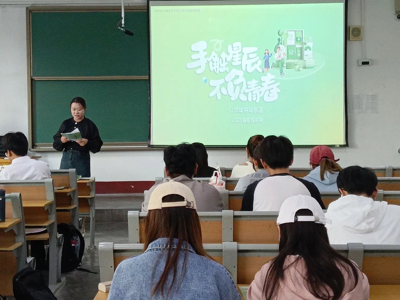 二是开展“‘就’在金秋,‘职’面未来”JM华中华东区(OPPO营销服务商)招聘会。学院邀请JM华中华东区OPPO独家代理商人力资源部帖春焕于东校区1#205开展JM华中华东区(OPPO营销服务商)2025届校园招聘会,学院2025届毕业生参加会议。会上,帖春焕从项目规划、招聘计划、福利待遇、晋升通道、招聘流程等多个方面,并围绕毕业生关心的岗位申请、轮岗安排等问题进行了深入解答,有针对性地了解毕业生的就业意向、就业观念。同时,在互动环节中2025届商院学子与用人单位进行了深入细致的沟通交流,有效了解把握了当前阶段有关企业的用人需求和岗位招聘条件等信息,为后续择业就业奠定了坚实基础。)