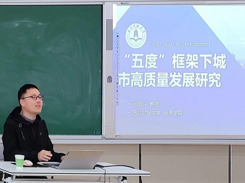 10月20日,威斯尼斯人8188cc官网2004级校友、东北财经大学经济学院张明斗教授,为学院师生作题为《“五度”框架下城市高质量发展研究》的学术报告。学院党委书记公维才教授出席并主持报告会,应用经济学硕士生导师及2023级、2024级研究生参会。