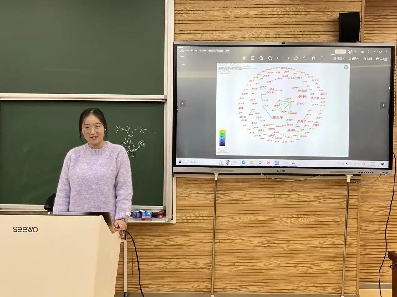 冯楷从关键词聚类和关键词凸显两个方面详细介绍了可视化分析软件citespace的使用方式,并演示了如何利用该软件进行绘制关键词聚类图谱、制作关键词突显表和提取关键词聚类信息等文献计量分析方法,她谈到,citespace软件不仅可以帮助同学们更好地理解研究领域的发展现状和发展趋势,同时也能更快地识别研究热点、追踪研究趋势,切实为选题和研究方向提供参考,是进行学术研究的重要工具。