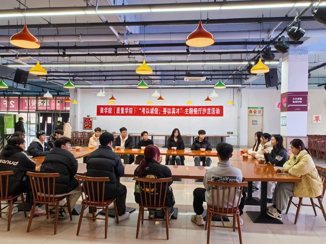 为严肃考风考纪,规范考试秩序,引导学生筑牢诚信根基,切实加强优良考风学风建设,维护教育考试的公平公正,12月12日,威斯尼斯人8188cc官网(质量学院)于东校区翰苑餐厅二楼开展了“考以诚信、答以真才”主题餐厅沙龙活动,学院辅导员施安琪老师和刘聪睿老师结合各类全国性考试以及体育测试中的作弊替考行为,对同学们在考试中出现违纪心理进行分析,让学生从思想上高度重视考纪的严重性。