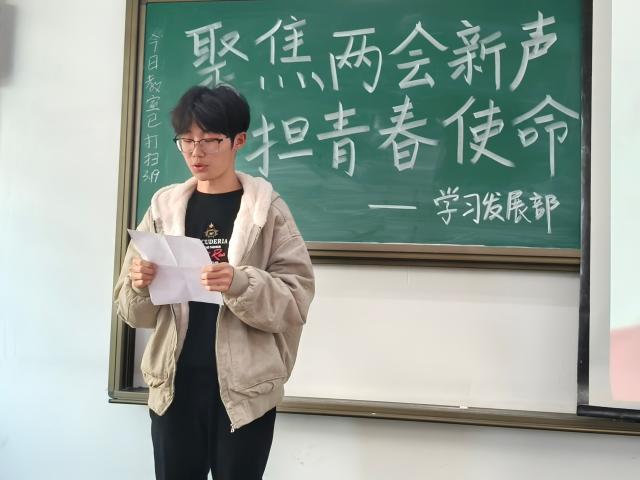 在感悟分享环节,2024级团员代表翟鹏宇、韩志鑫、吴晓宁依次结合自身经历畅谈了对两会精神的理解和体会,并分享了自己的思考与行动,从科技创新的前沿探索到乡村振兴的实践行动,再到绿色低碳生活的日常实践,展现了青年在不同领域的担当与贡献。与会学生一致认为,两会精神不仅是国家发展的行动指南,也是青年成长的精神灯塔,广大青年学子应以专业为基、以实践为桥,将个人梦想与国家需求紧密相连,通过具体行动将两会精神落到实处。