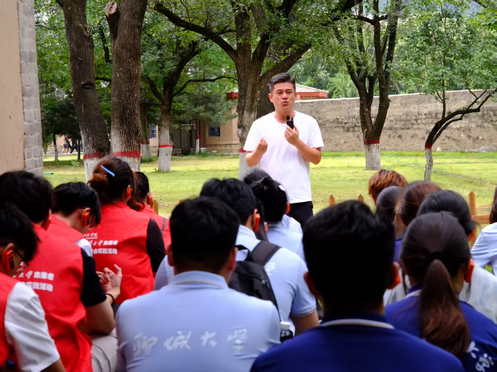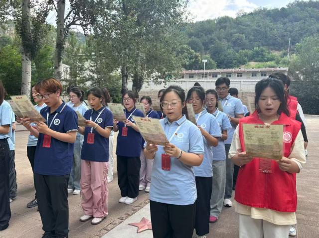 踏入旧址前,实践队员们庄重集结于张思德纪念广场。面对不朽的雕像,队员们齐声诵读《为人民服务》。“为人民利益而死,就比泰山还重”——张思德同志那金子般的誓言,与共产党人矢志不渝的全心全意为人民服务的宗旨,在肃穆的空气中激荡回响。字句铿锵,仿佛穿透时空,让大家触摸到先辈们朴素外表下那颗滚烫而坚定的赤子之心,经历了一次灵魂深处的庄严洗礼。