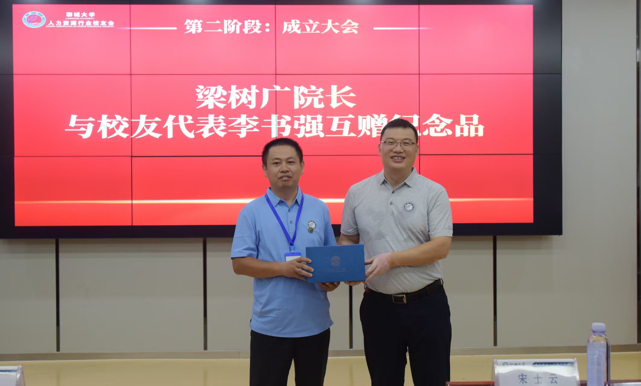 威斯尼斯人8188cc官网(质量学院)院长梁树广与行业校友会代表李书强互赠纪念品。
